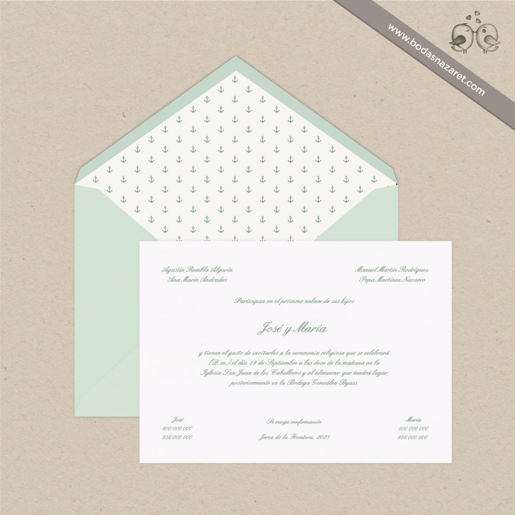 Invitación de boda con sobre agua marina (22,8x16,5cm) realizado con papel italiano verjurado de alta calidad (140g), forrado de manera artesanal y con tarjetón blanco verjurado de 300g (22x15,5cm) a juego totalmente personalizable. Con un diseño de anclitas, es una opción ideal para una boda en la playa o marina.