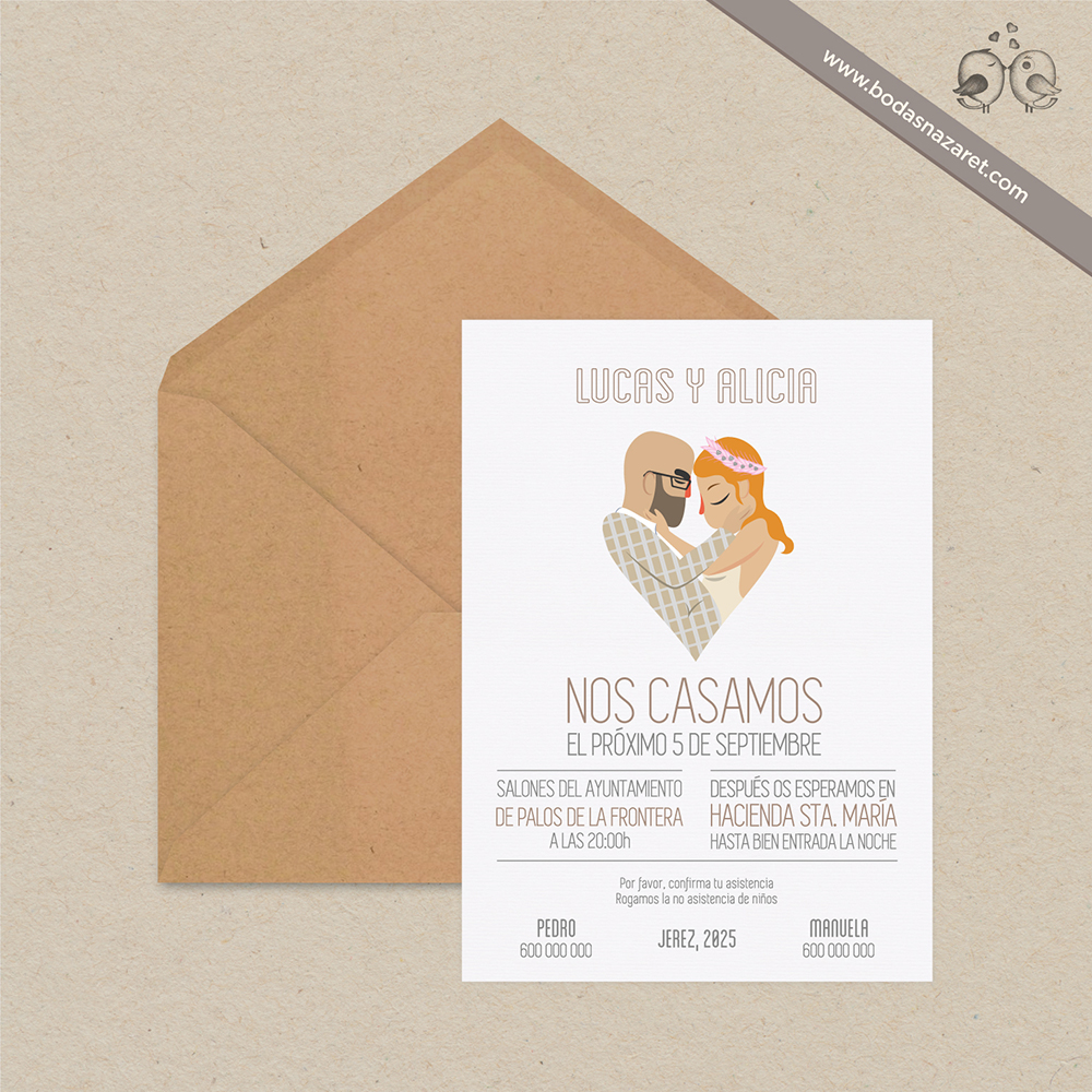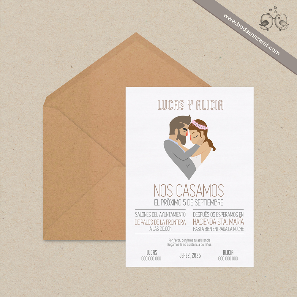 Invitación de boda con sobre realizado con papel kraft (22,8x16,5 cm)de alta calidad (130g), con tarjetón blanco verjurado de 300g (22x15,5cm) a juego totalmente personalizable. Con un diseño ilustrado y actual, es una opción ideal para una boda diferente, estilosa y moderna.Además, también puedes personalizar: