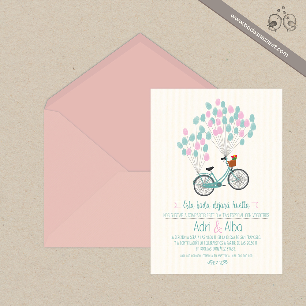 Invitación de boda con sobre agua marina (22,8x16,5cm) realizado con papel natural de alta calidad (140g) con textura rayada por ambas caras o con sobre rosa (22,8x16,5cm) realizado con papel natural de alta calidad (140g) con textura por ambas caras, con tarjetón blanco verjurado de 300g (22x15,5cm) a juego totalmente personalizable. Con un ilustración de bicicleta vintage y huellas, es una opción ideal para una boda original y chic.