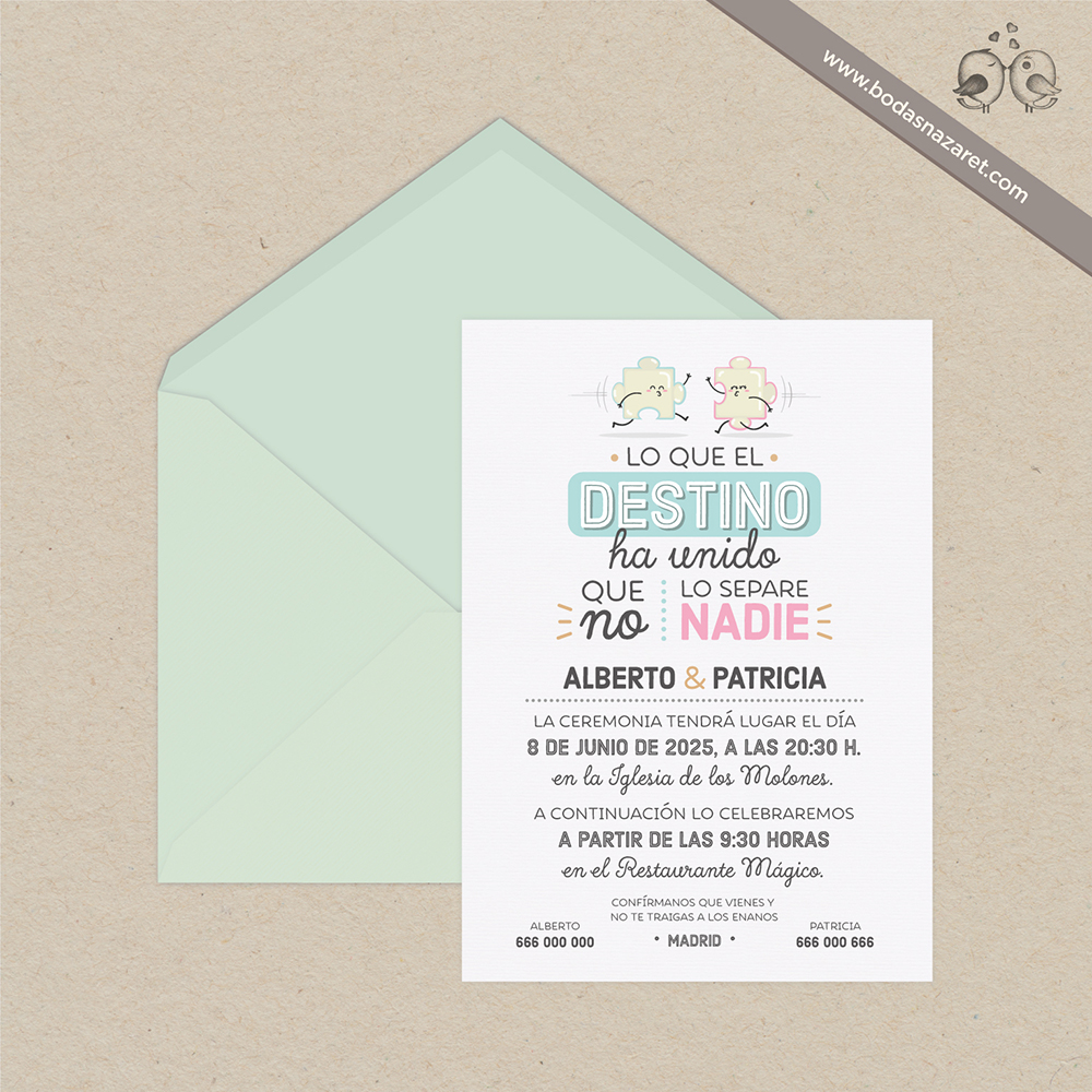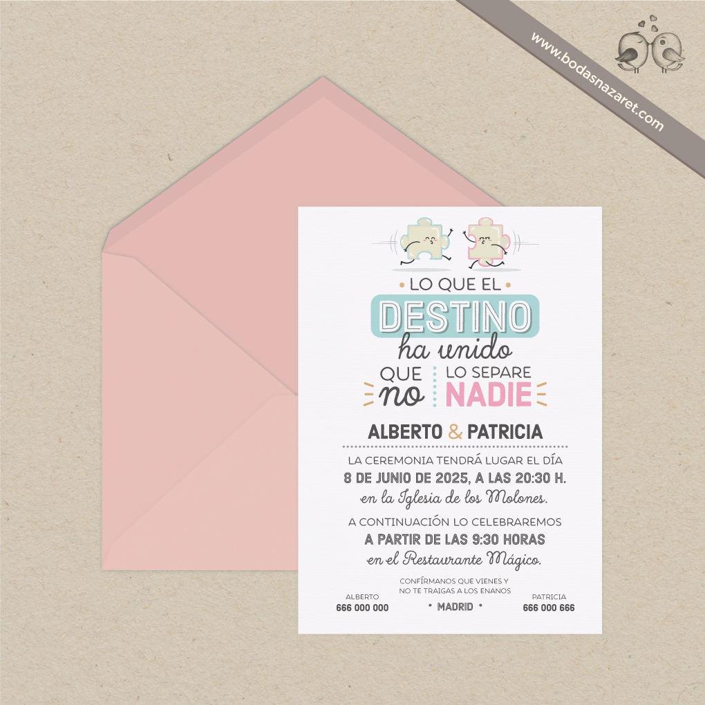 Invitación de boda con sobre agua marina (22,8x16,5cm) realizado con papel italiano natural de alta calidad (140g) con textura rayada por ambas caras o sobre rosa (22,8x16,5 cm) realizado con papel italiano con natural de alta calidad (140g) con textura por ambas caras, con tarjetón blanco verjurado de 300g (22x15,5 cm) a juego totalmente personalizable. Con un diseño molón, es una opción ideal para una boda original y divertida.Además, también puedes personalizar:
