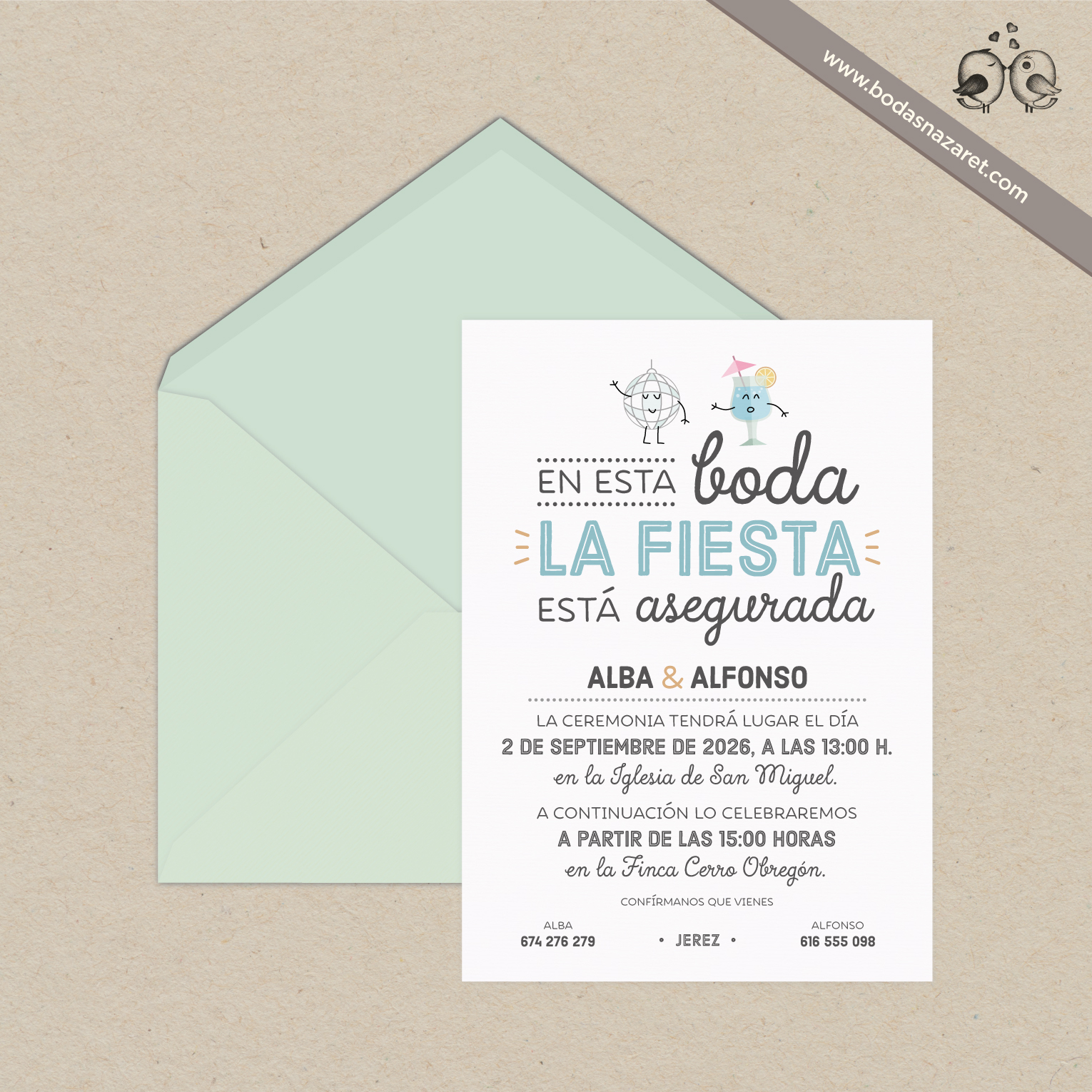 Invitación de boda con sobre agua marina (22,8x16,5cm) realizado con papel italiano natural de alta calidad (140g) con textura rayada por ambas. caras, con tarjetón blanco verjurado en cartulina de 300g (22x15,5cm) a juego totalmente personalizable. Con un diseño molón, es una opción ideal para una boda original y divertida.Además, también puedes personalizar: