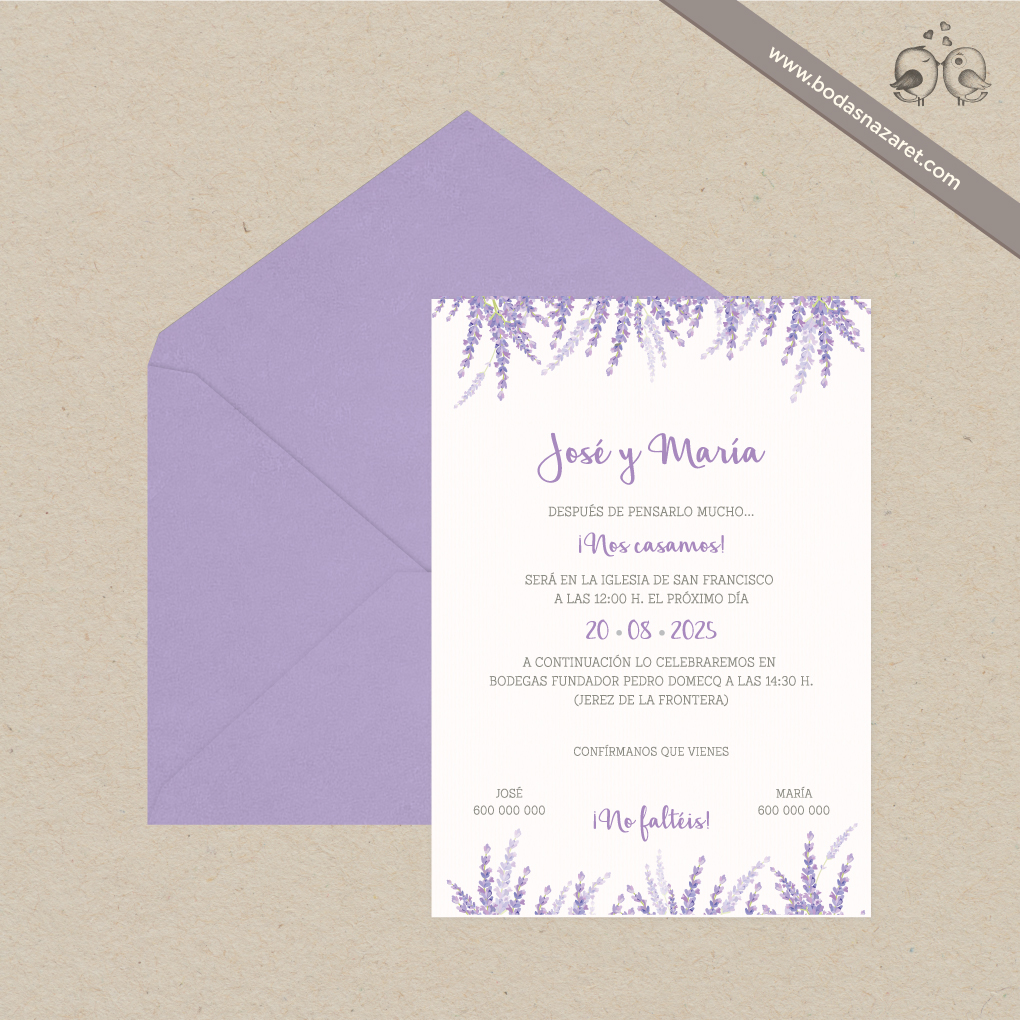 Invitación de boda con sobre malva (22,8x16,5cm) realizado con papel italiano con textura de alta calidad (140g) y con tarjetón blanco verjurado de 300g (22x15,5cm) totalmente personalizable. Con un diseño de flores de lavanda en tonos lilas y morados es una opción ideal para una boda alegre y fresca.Además, también puedes personalizar: