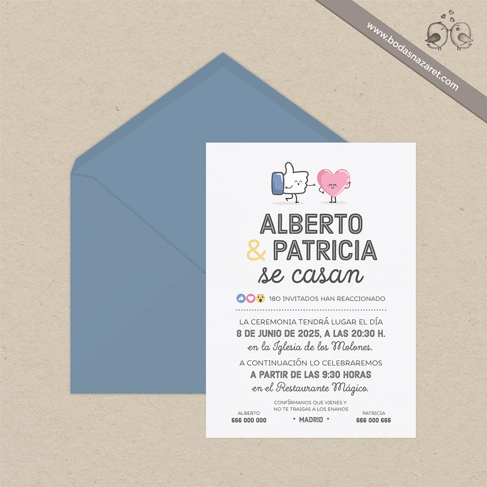 Invitación de boda con sobre celeste (22,8x16,5cm) realizado con papel italiano natural de alta calidad (140g) con textura rayada por ambas caras, con tarjetón verjurado de 300g (22x15,5cm) a juego totalmente personalizable. Con un diseño molón, es una opción ideal para una boda original y divertida.Además, también puedes personalizar: