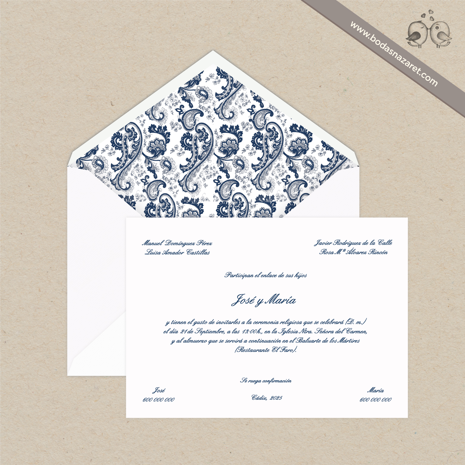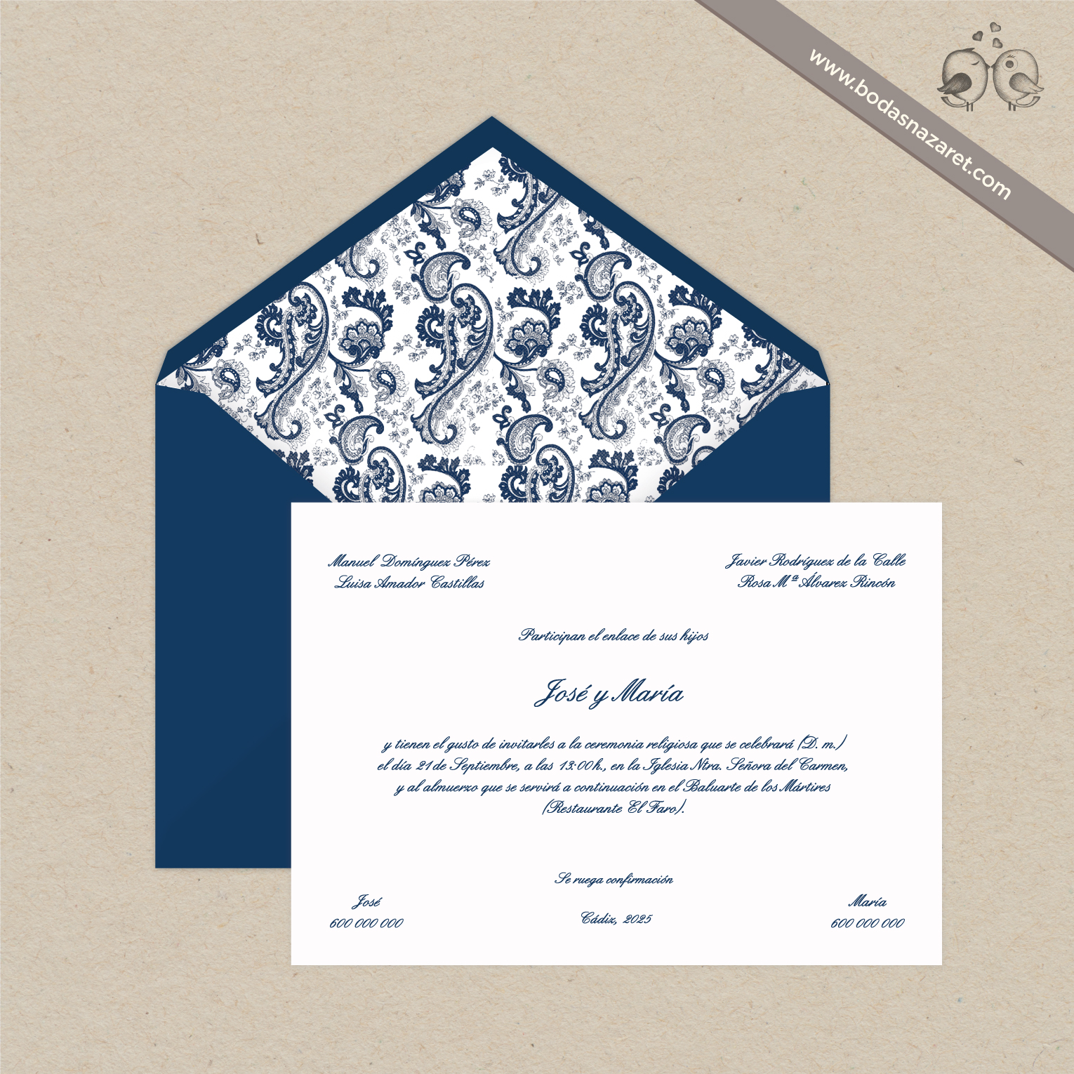 Invitación de boda con sobre blanco (22,8 x 16 cm) realizado con papel italiano de alta calidad con textura rayada por ambas caras (140g), forrado de manera artesanal y con tarjetón blanco verjurado de 300g. (22 x 15,5 cm). Con un diseño de cachemir, es una opción ideal para una elegante.Además, también puedes personalizar: