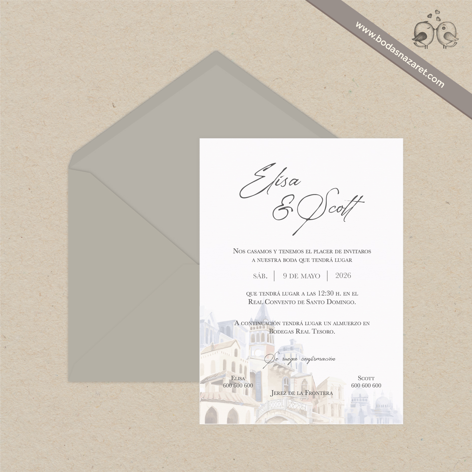 Invitación de boda con sobre gris verdoso (22,8x16,5cm) hecho de papel italiano natural de alta calidad (140g) con textura rayada por ambas caras y tarjetón blanco verjurado de 300g (22x15,5cm) totalmente personalizable. Con un diseño de moderno es una opción ideal para una boda original y elegante.Además, también puedes personalizar: