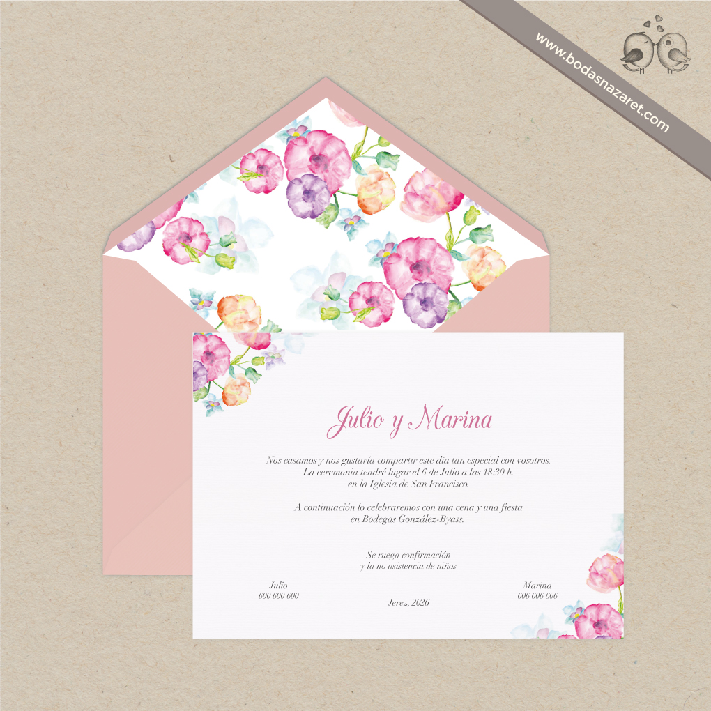 Invitación de boda con sobre blanco (22,8x16,5cm) realizado con papel italiano verjurado de alta calidad (140g) o sobre rosa (22,8x16,5cm) realizado con papel italiano con textura de alta calidad (140g), forrado de manera artesanal y con tarjetón blanco verjurado de 300g (22x15,5cm) a juego totalmente personalizable. Con un diseño floral, es una opción ideal para una boda chic y vintage.Además, también puedes personalizar: