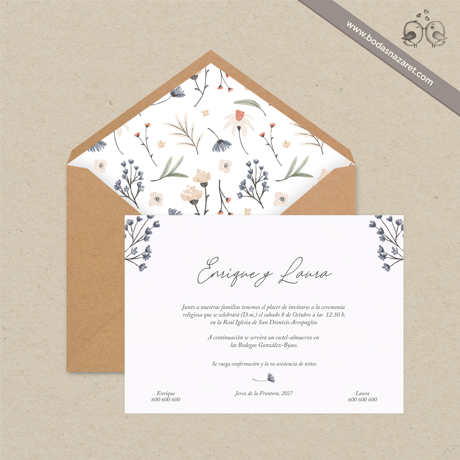 Invitación de boda con sobre realizado con papel kraft (22,8x16,5cm) de alta calidad (130g), forrado de manera artesanal y tarjetón blanco verjurado de 300g (22x15,5cm) a juego totalmente personalizable. Con un diseño de flores, es una opción ideal para una boda alegre y vintage.Además, también puedes personalizar: