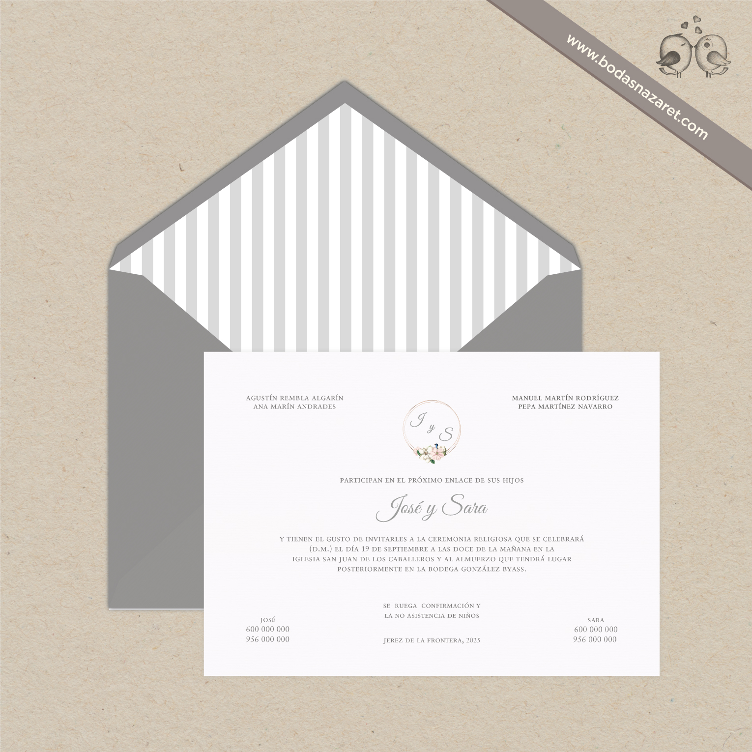 Invitación de boda con sobre gris (22,8x16,5cm) realizado con papel italiano natural de alta calidad (140g) con textura rayada por ambas caras, forrado de manera artesanal y tarjetón blanco verjurado de 300g (22x15,5cm) a juego totalmente personalizable. Con un diseño de rayas, es una opción ideal para una boda alegre y chic.Además, también puedes personalizar: