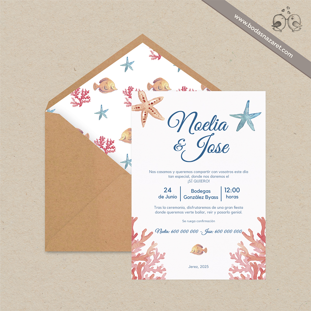 Invitación de boda con sobre celeste (22,8x16,5cm) realizado con papel italiano natural de alta calidad (140g) con textura rayada por ambas caras o sobre kraft realizado con papel de alta calidad (130g), forrado de manera artesanal y con tarjetón blanco verjurado de 300g (22x15,5 cm) a juego totalmente personalizable. Con un diseño marino para una boda chic y alegre.Además, también puedes personalizar: