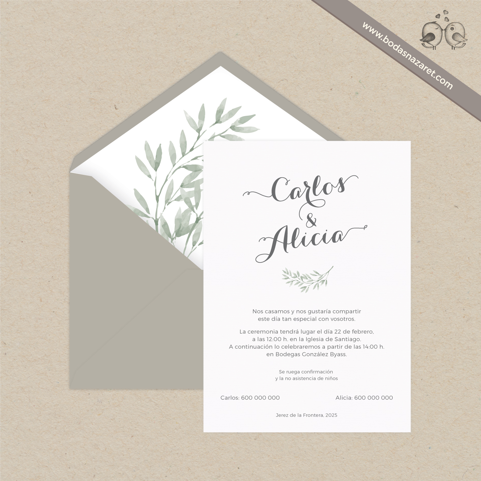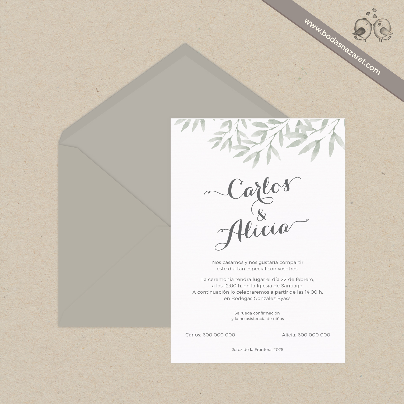 Invitación de boda con sobre gris verdoso (22,8x16,5cm) realizado con papel italiano natural de alta calidad (140g) con textura rayada por ambas caras, con opción de forrado de manera artesanal y tarjetón blanco verjurado de 300g (22x15,5cm) a juego totalmente personalizable. Con un diseño de hojas de olivo, es una opción ideal para una boda alegre y sencilla.Además, también puedes personalizar: