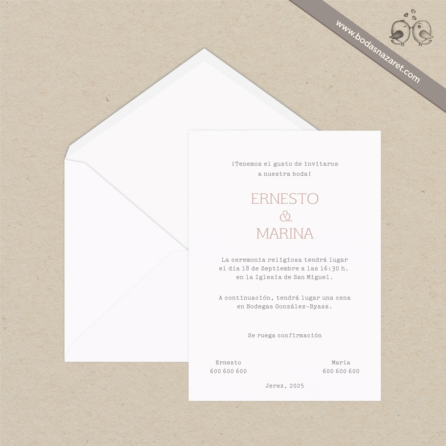 Invitación de boda con sobre blanco (22,8x16,5cm) realizado con papel italiano verjurado de alta calidad (150g) y con tarjetón blanco verjurado en cartulina de 300g (22x15,5cm) totalmente personalizable. Con un diseño fresco, es una opción ideal para una boda moderna y elegante.Además, también puedes personalizar: