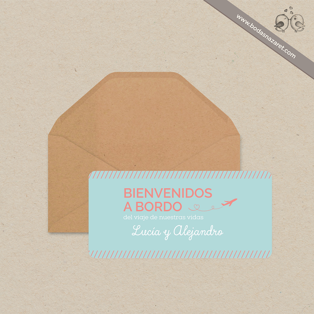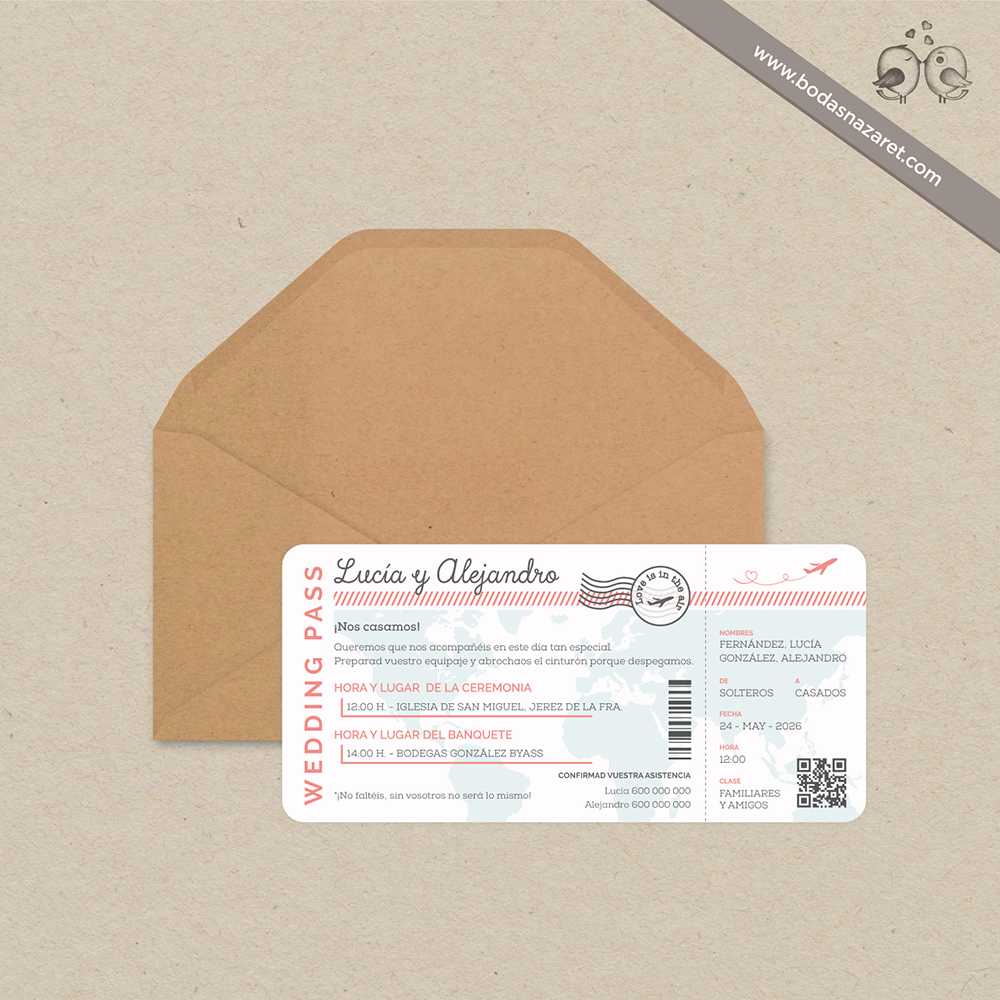 Invitación de boda con sobre realizado con papel kraft de alta calidad (100g) y tarjetón de 300g semimate (10 x 21 cm) , impreso a doble cara totalmente personalizable. Con un diseño de tarjeta de embarque es una opción ideal para una boda viajera y original.Además, también puedes personalizar: