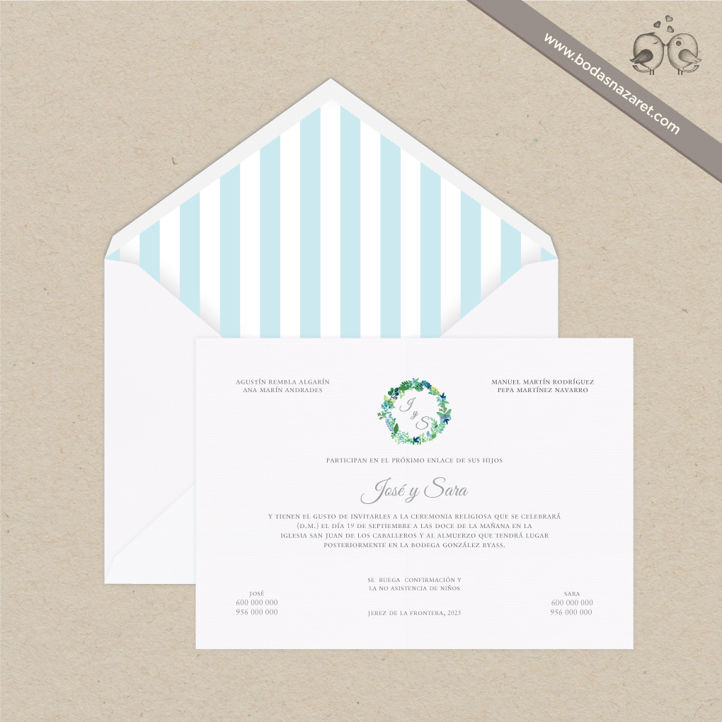 Invitación de boda con sobre blanco (22,8x16,5cm) realizado con papel italiano verjurado de alta calidad (140g), forrado de manera artesanal y con tarjetón blanco verjurado de 300g (22x15,5cm) a juego totalmente personalizable. Con un diseño de rayas, es una opción ideal para una boda fina y elegante.