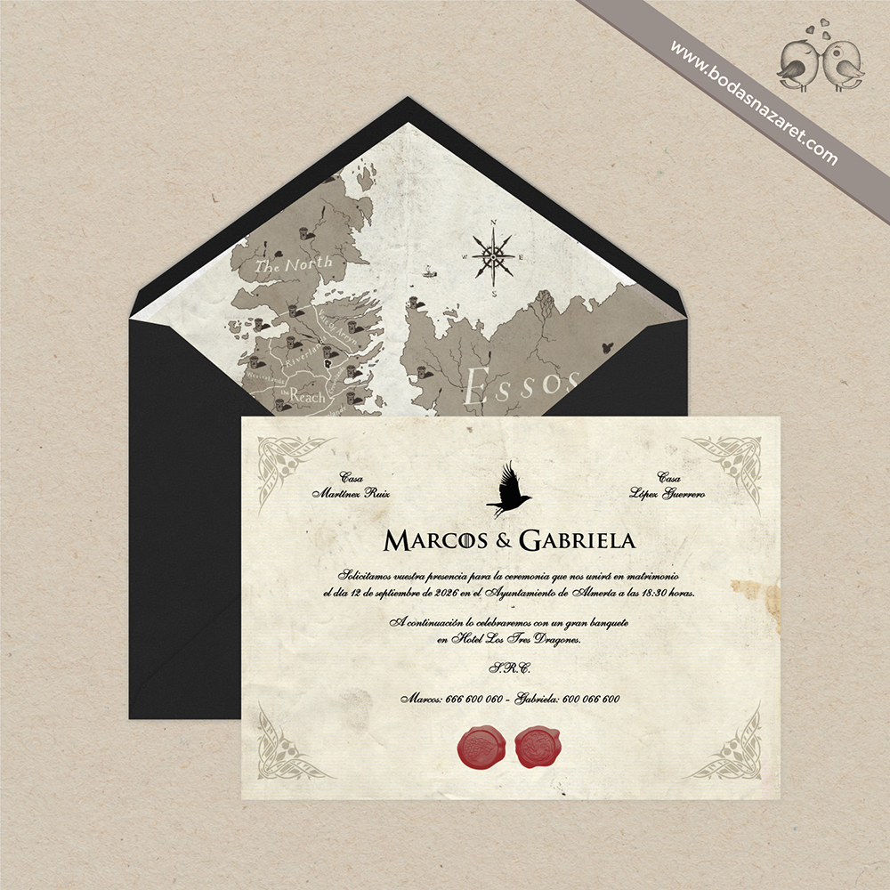 Invitación de boda con sobre negro (22,8x16,5cm) realizado con papel italiano natural de alta calidad (140g), forrado de manera artesanal y tarjetón blanco verjurado de 300g (22x15,5cm) totalmente personalizable. Con un diseño de Juego de Tronos es una opción ideal para una boda divertida y original.Además, también puedes personalizar: