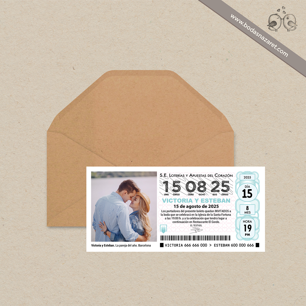 Invitación de boda con sobre realizado con papel kraft de alta calidad (100g) y tarjetón blanco en 300g (10x21cm) totalmente personalizable. Con un diseño de décimo de loteria es una opción ideal para una boda atrevida y original.Además, también puedes personalizar: