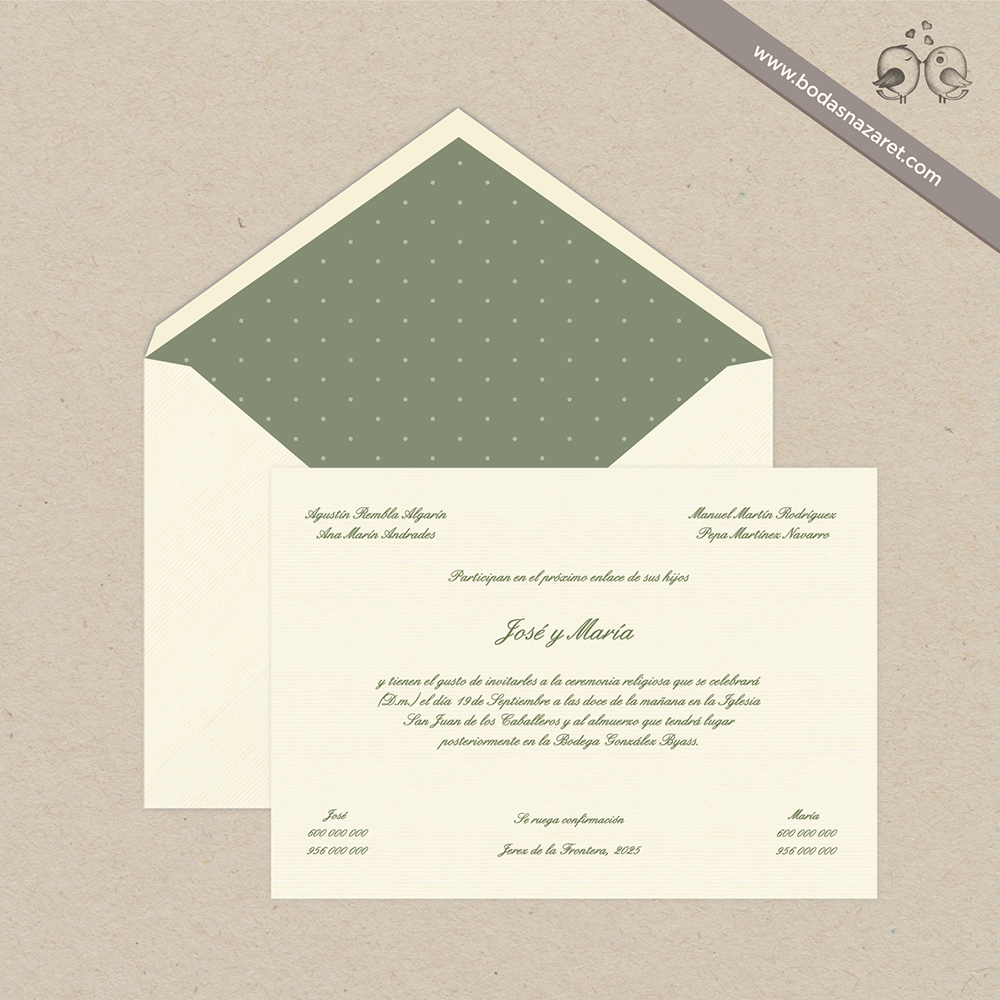 Invitación de boda con sobre crema (22,8x16,5cm) realizado con papel italiano natural de alta calidad (150g) con textura rayada por ambas caras, forrado de manera artesanal y tarjetón crema verjurado de 300g (22x15,5cm) a juego totalmente personalizable. Con un diseño de topos, es una opción ideal para una boda alegre y elegante.Además, también puedes personalizar: