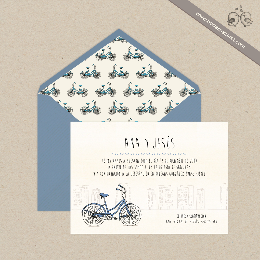 Invitación de boda con sobre celeste (22,8x16,5cm) realizado con papel italiano natural de alta calidad (140g) con textura rayada por ambas caras, forrado de manera artesanal y con tarjetón blanco verjurado de 300g (22x15,5cm) a juego totalmente personalizable. Con un diseño de bicicletas, es una opción ideal para una boda alegre y vintage.Además, también puedes personalizar: