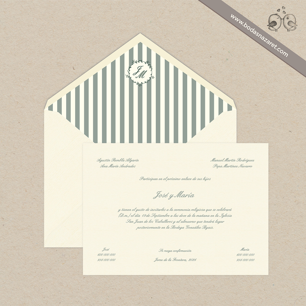 Invitación de boda con sobre crema (22,8x16,5cm) realizado con papel italiano natural de alta calidad (150g) con textura rayada por ambas caras, forrado de manera artesanal y tarjetón crema verjurado de 300g (22x15,5cm) a juego totalmente personalizable. Con un diseño de rayas, es una opción ideal para una boda chic y vintage.