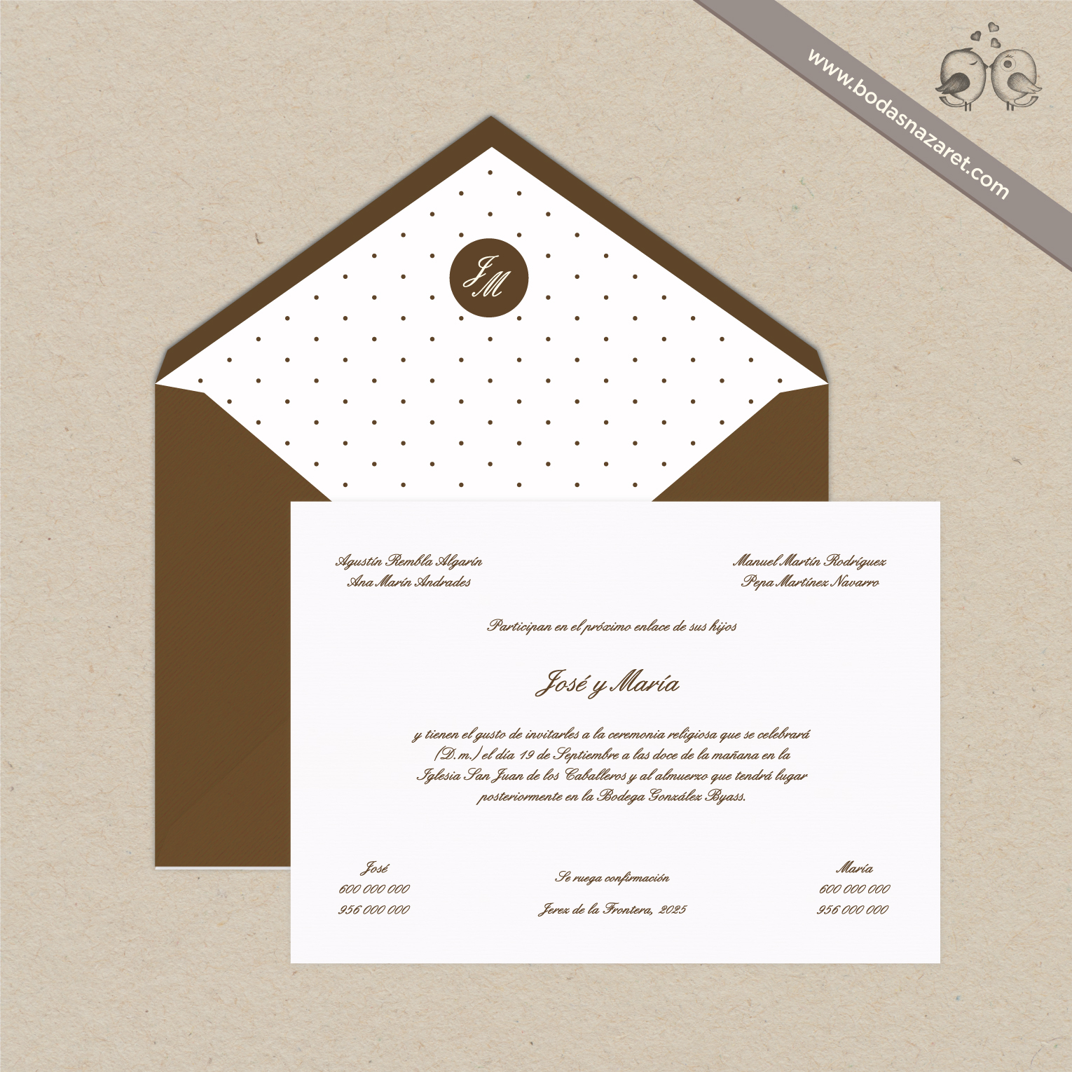 Invitación de boda con sobre marrón oscuro (2,8x16,5cm) realizado con papel italiano verjurado de alta calidad (140g), forrado de manera artesanal y con tarjetón blanco verjurado de 300g (22x15,5cm) a juego totalmente personalizable. Con un diseño de topos, es una opción ideal para una boda alegre y elegante.Además, también puedes personalizar: