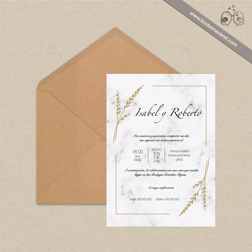 Invitación de boda con sobre realizado con papel kraft (22,8x16,5cm) de alta calidad (140g), con tarjetón blanco verjurado de 300g (22x15,5cm) a juego totalmente personalizable. Con un diseño de flores, es una opción ideal para una boda alegre y vintage.Además, también puedes personalizar: