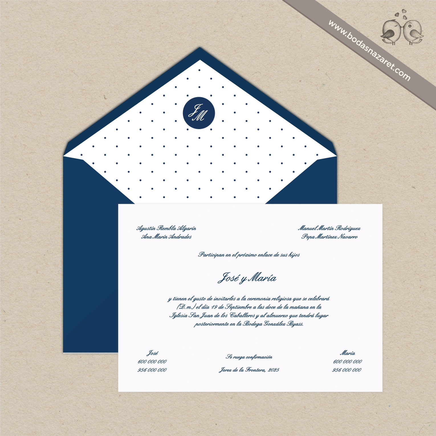 Invitación de boda con sobre azul (22,8x16,5cm) realizado con papel italiano verjurado de alta calidad (140g), forrado de manera artesanal y con tarjetón blanco verjurado de 300g (22x15,5cm) a juego totalmente personalizable. Con un diseño de topos, es una opción ideal para una boda alegre y elegante.Además, también puedes personalizar: