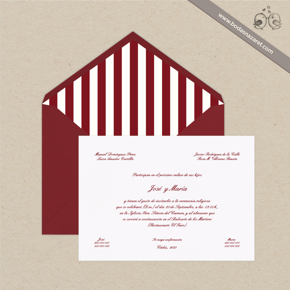 Invitación de boda con sobre rojo (22,8x16,5cm) realizado con papel italiano liso de alta calidad (140g), forrado de manera artesanal y con tarjetón blanco verjurado de 300g (22x15,5cm) a juego totalmente personalizable. Con un diseño de rayas, es una opción ideal para una boda alegre y divertida.Además, también puedes personalizar: