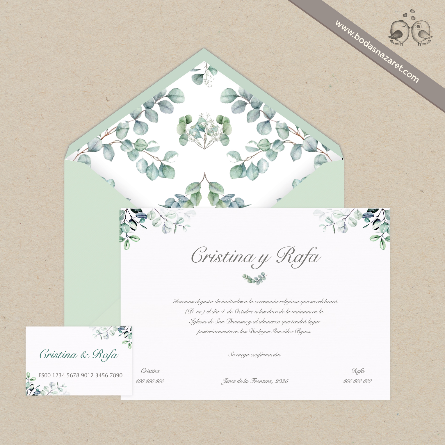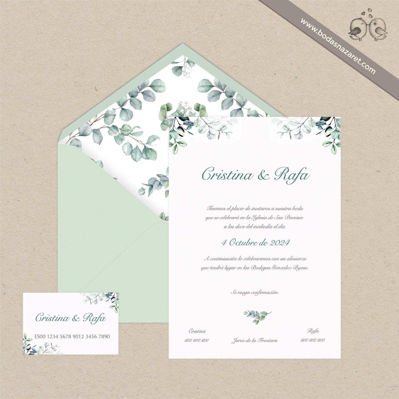 Invitación de boda con sobre agua marina (22,8x16,5cm) realizado con papel italiano natural de alta calidad con textura rayada por ambas caras (140g), forrado de manera artesanal y tarjetón blanco verjurado de 300g (22x15,5cm) a juego totalmente personalizable. Con un diseño de hojas de eucalipto, es una opción ideal para una boda alegre y vintage.Además, también puedes personalizar: