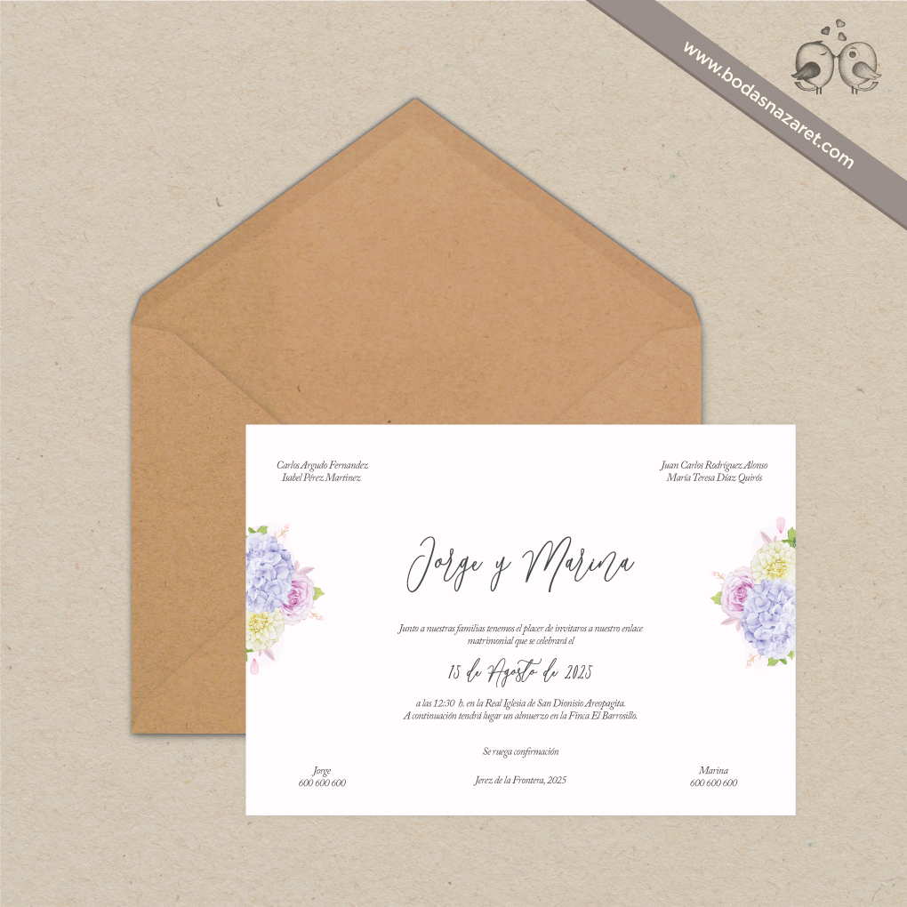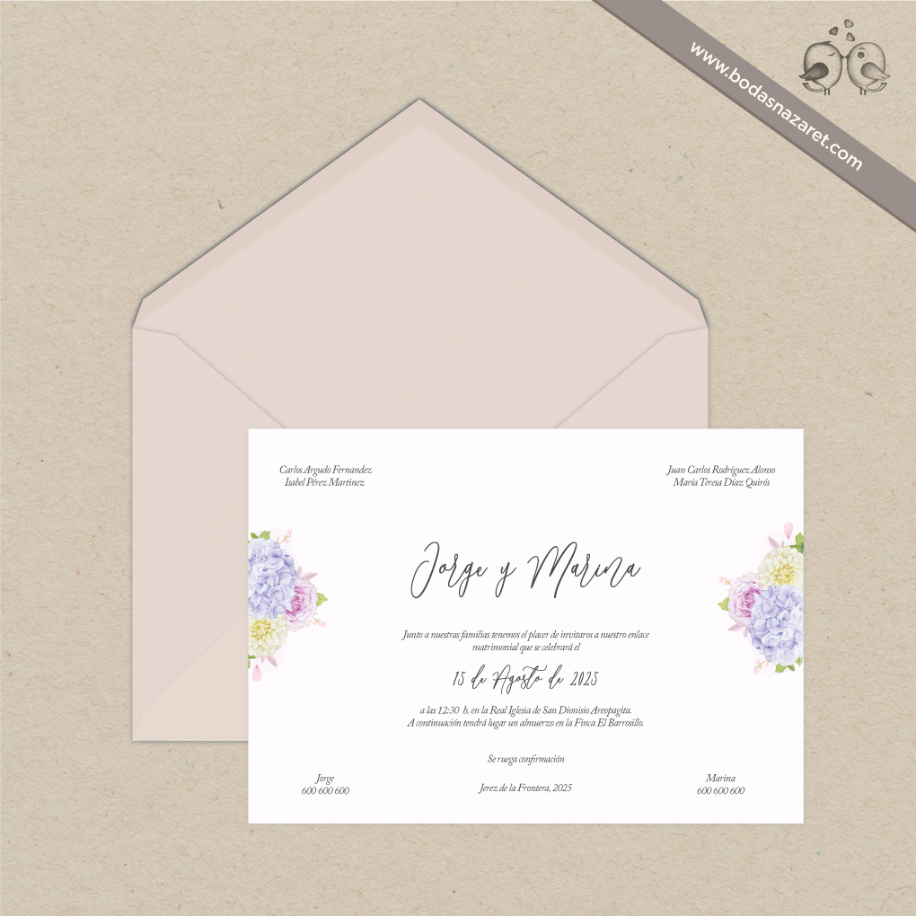Invitación de boda con sobre rosa nude (22,8x16,5cm) realizado con papel italiano verjurado de alta calidad (140g) o sobre realizado con papel kraft (22,8x16,5cm) de alta calidad (140g). con tarjetón blanco verjurado de 300g (22x15,5cm) a juego totalmente personalizable. Con un diseño de flores, es una opción ideal para una boda alegre y vintage.