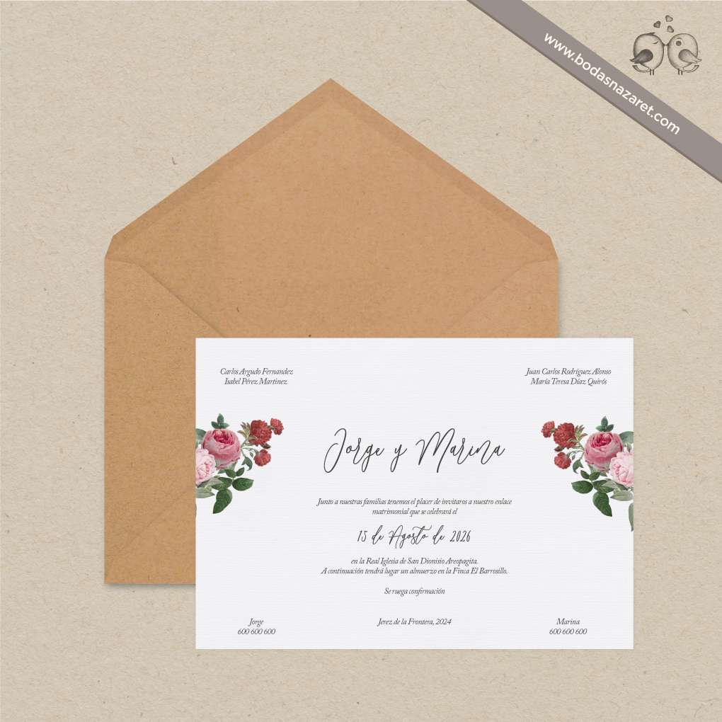 Invitación de boda con sobre realizado con papel kraft (22,8x16,5cm) de alta calidad (140g), con tarjetón blanco verjurado de 300g (22x15,5cm) totalmente personalizable. Con un diseño de flores, es una opción ideal para una boda alegre y vintage.Además, también puedes personalizar: