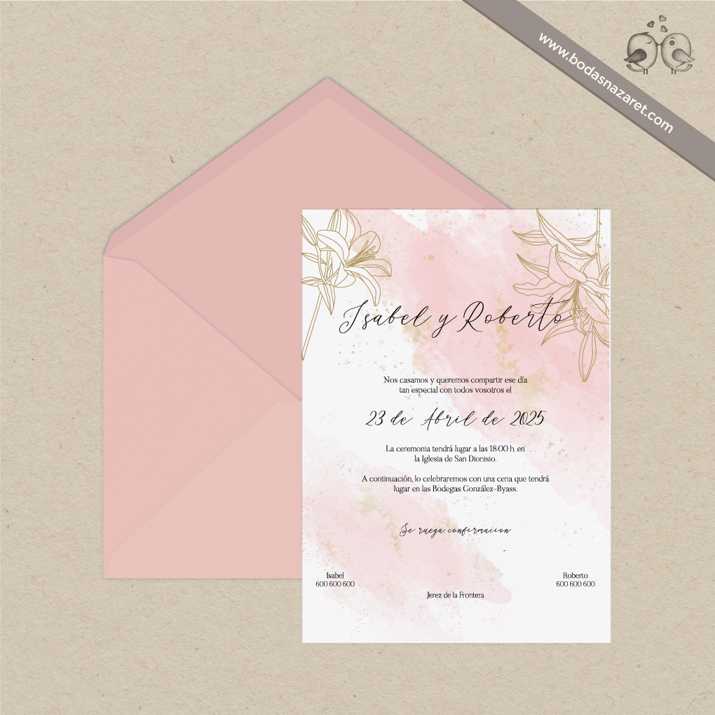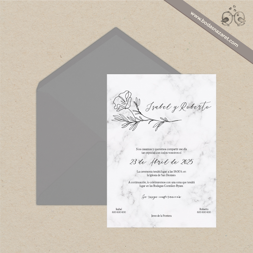 Invitación de boda con sobre gris (22,8x16,5cm) realizado con papel italiano verjurado de alta calidad (140g) o sobre blanco (22,8x16,5cm) realizado con papel italiano verjurado de alta calidad (140g), con tarjetón blanco verjurado de 300g (22x15,5cm) totalmente personalizable. Con un diseño de flores, es una opción ideal para una boda alegre y vintage.Además, también puedes personalizar:
