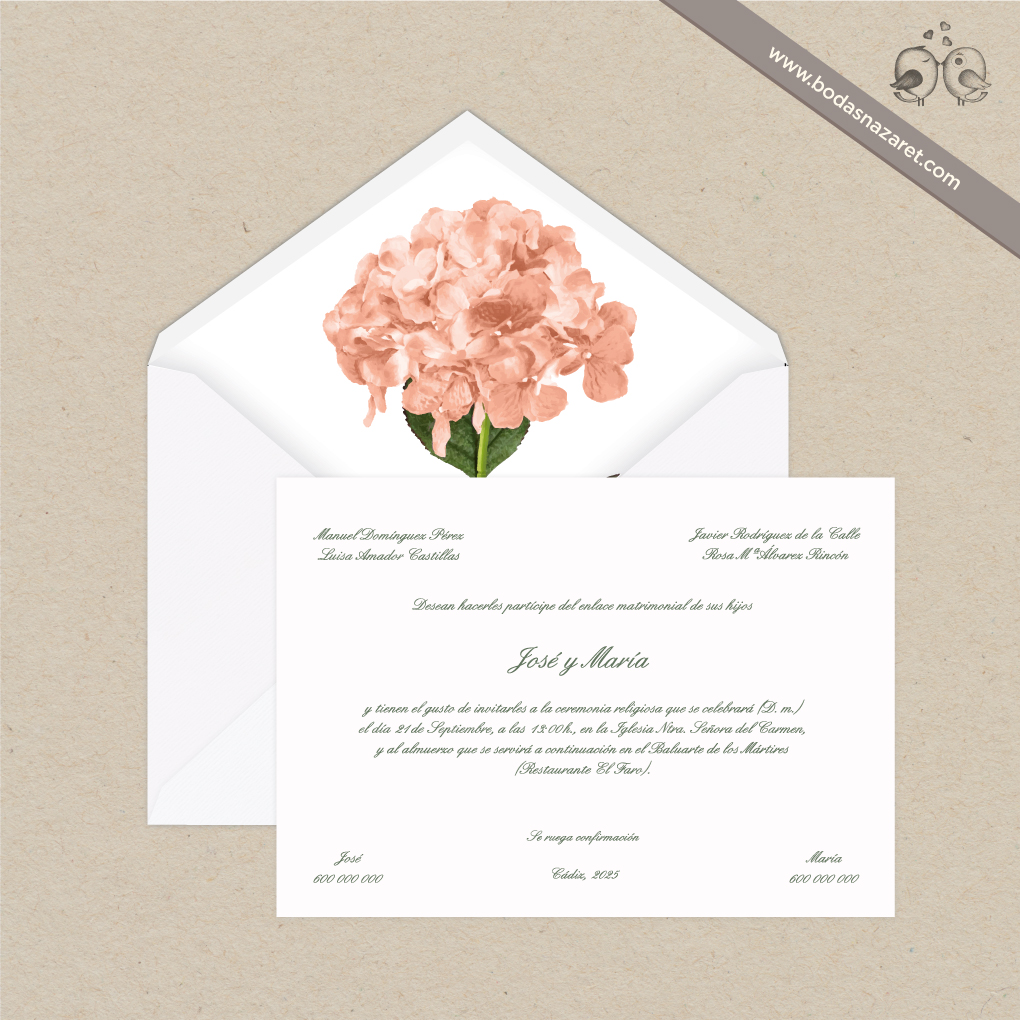 Invitación de boda con sobre blanco (22,8x16,5cm) realizado con papel italiano verjurado de alta calidad (140g), forrado de manera artesanal y con tarjetón blanco verjurado de 300g (22x15,5cm) a juego totalmente personalizable. Con un diseño floral, es una opción ideal para una elegante.Además, también puedes personalizar: