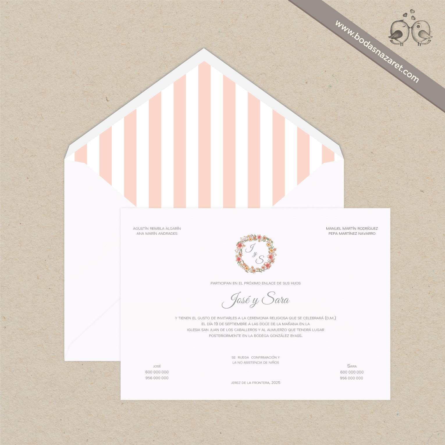 Invitación de boda con sobre blanco (22,8x16,5cm) realizado con papel italiano verjurado de alta calidad (140g), forrado de manera artesanal y con tarjetón blanco verjurado de 300g (22x15,5cm) a juego totalmente personalizable. Con un diseño de rayas, es una opción ideal para una boda chic y vintage.Además, también puedes personalizar: