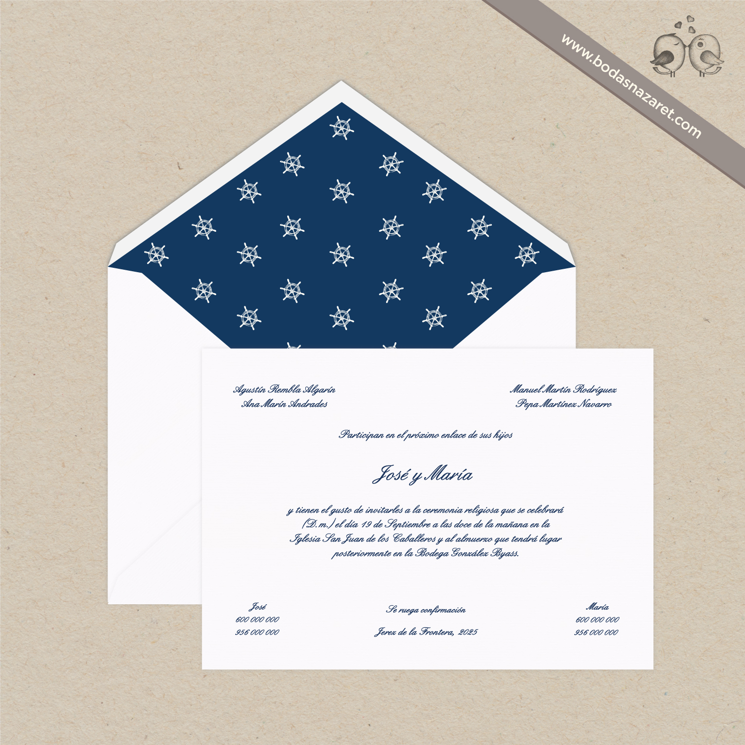 Invitación de boda con sobre blanco (22,8x16,5cm) realizado con papel italiano natural de alta calidad (140g) con textura rayada por ambas caras, forrado de manera artesanal y tarjetón blanco verjurado de 300g (22x15,5cm) juego totalmente personalizable. Con un diseño marinero, es una opción ideal para una boda única y elegante.Además, también puedes personalizar: