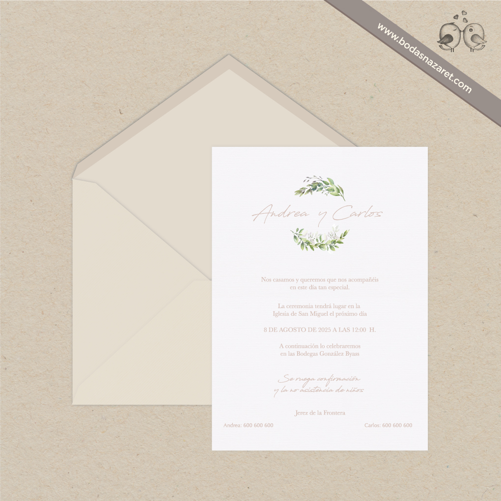 Invitación de boda con sobre crema tostado (22,8x16,5cm) realizado con papel italiano verjurado de alta calidad (140g), con tarjetón blanco verjurado de 300g (22x15,5cm) totalmente personalizable. Con un diseño de flores, es una opción ideal para una boda fina y elegante.