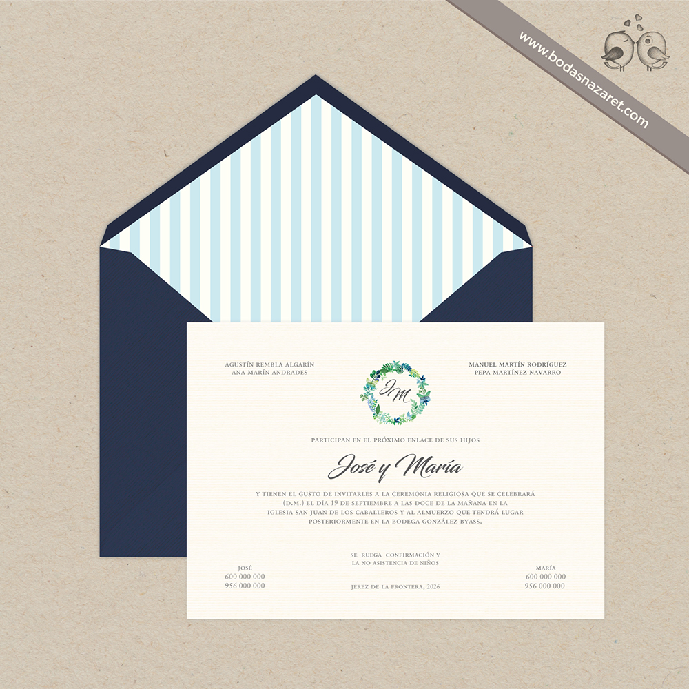 Invitación de boda con sobre azul (22,8x16,5cm) realizado con papel italiano verjurado de alta calidad (140g), forrado de manera artesanal y con tarjetón verjurado de 300g (22x15,5cm) a juego totalmente personalizable. Con un diseño de rayas, es una opción ideal para una boda chic y vintage.Además, también puedes personalizar: