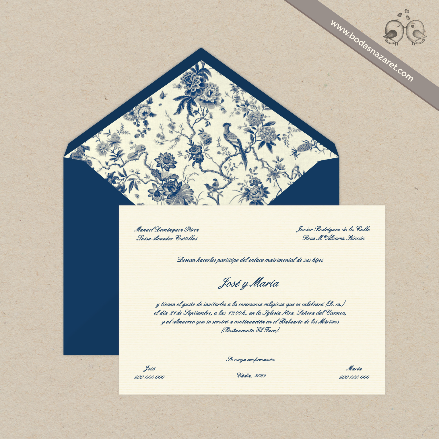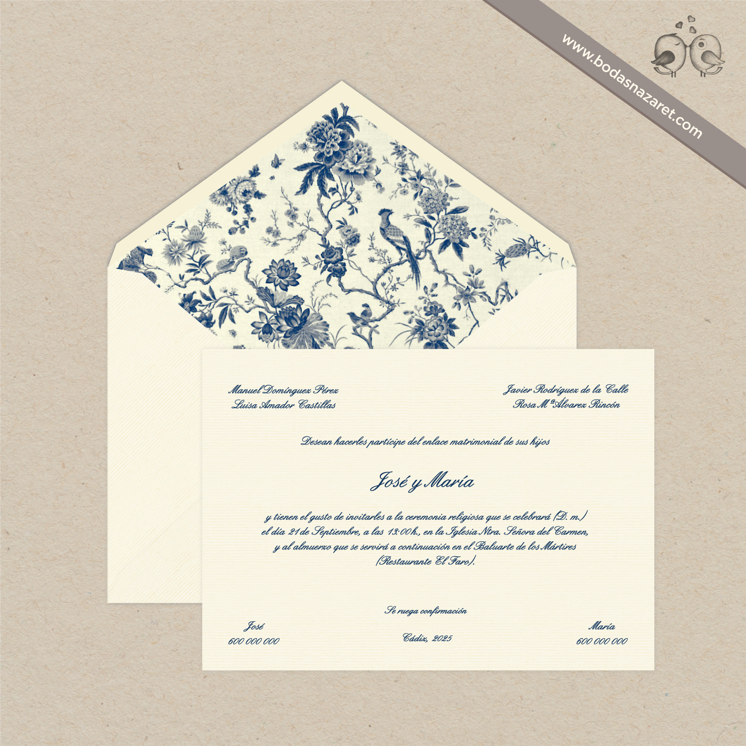 Invitación de boda con sobre crema (22,8 x 16 cm) con papel italiano natural de alta calidad con textura rayada por ambas caras (150g) o con sobre azul marino (22,8x16cm) realizado con papel italiano de alta calidad con textura rayada por ambas caras (140g), forrado de manera artesanal y con tarjetón crema verjurado en cartulina de 300g. (22 x 15,5 cm) a juego totalmente personalizable. Con un diseño Toile de Jouy, es una opción ideal para una boda vintage y elegante.Además, también puedes personalizar: