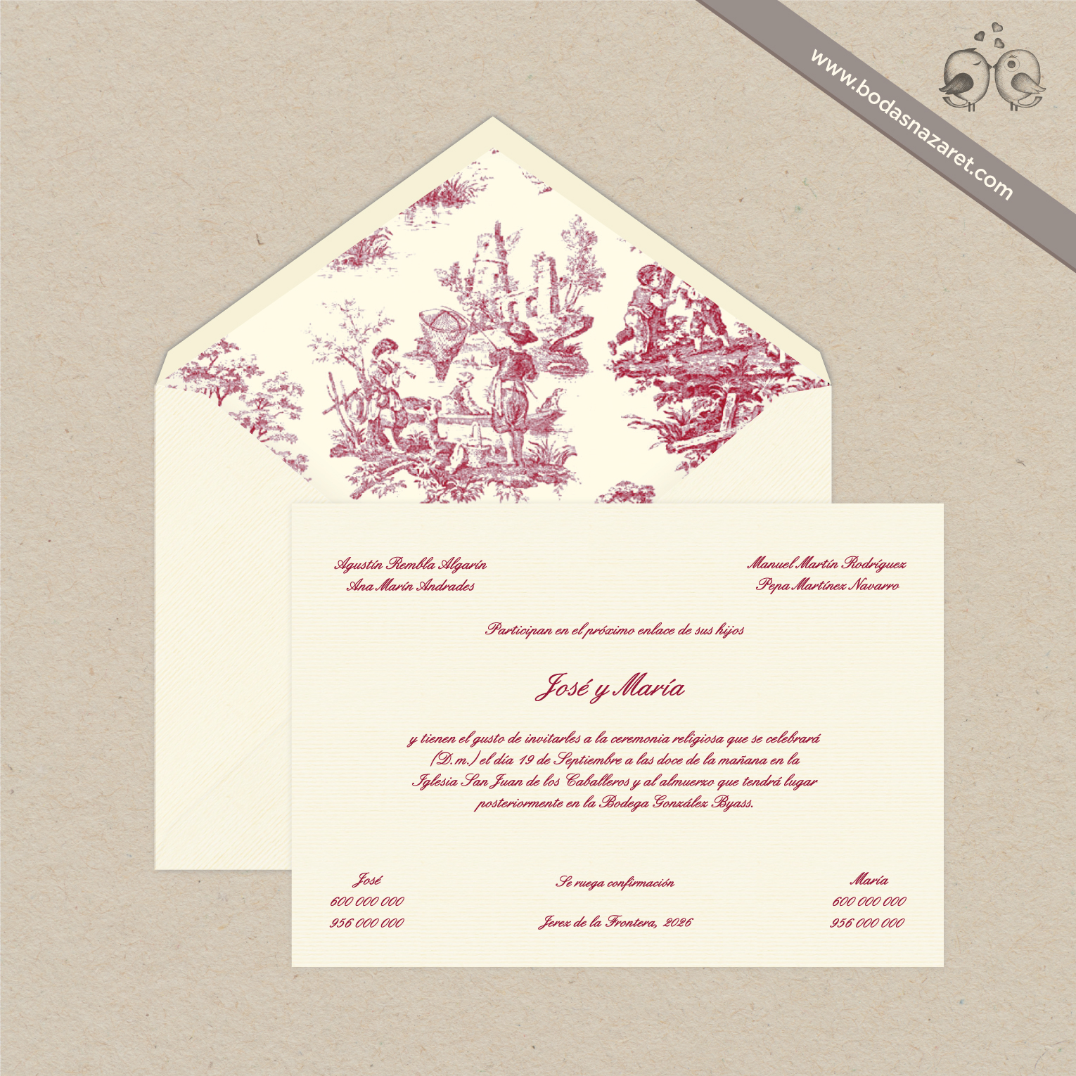 Invitación de boda con sobre crema (22,8x16cm) realizado con papel italiano natural de alta calidad con textura rayada por ambas caras (150g), forrado de manera artesanal y con tarjetón crema verjurado en cartulina de 300g (22x15,5cm) a juego totalmente personalizable. Con un diseño Toile de Jouy, es una opción ideal para una boda vintage y elegante.Además, también puedes personalizar: