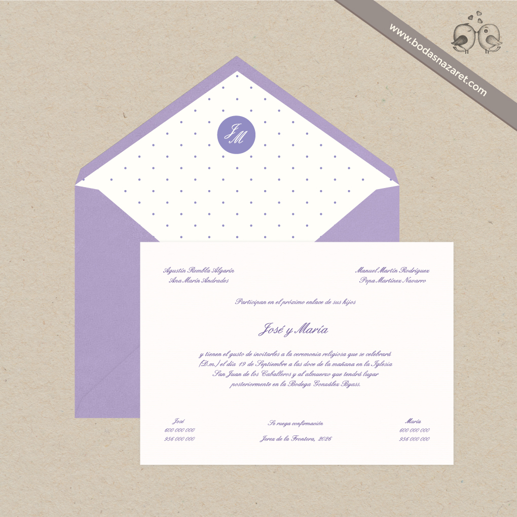 Invitación de boda con sobre malva (22,8x16,5cm) realizado con papel italiano con textura de alta calidad (140g), forrado de manera artesanal y con tarjetón blanco verjurado de 300g (22x15,5cm) a juego totalmente personalizable. Con un diseño de topos, es una opción ideal para una boda alegre y elegante.Además, también puedes personalizar:
