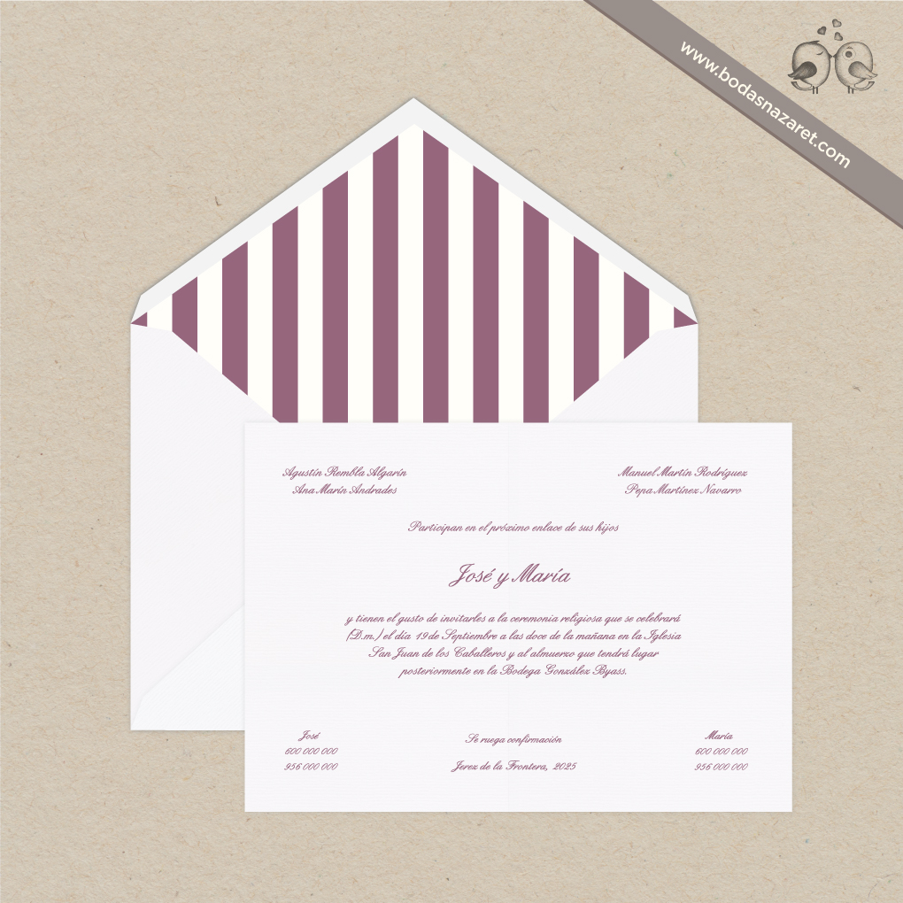 Invitación de boda con sobre blanco (22,8x16,5cm) realizado con papel italiano verjurado de alta calidad (140g), forrado de manera artesanal y con tarjetón blanco verjurado de 300g (22x15,5cm) a juego totalmente personalizable. Con un diseño de rayas berenjena, es una opción ideal para una boda moderna y alegre.Además, también puedes personalizar: