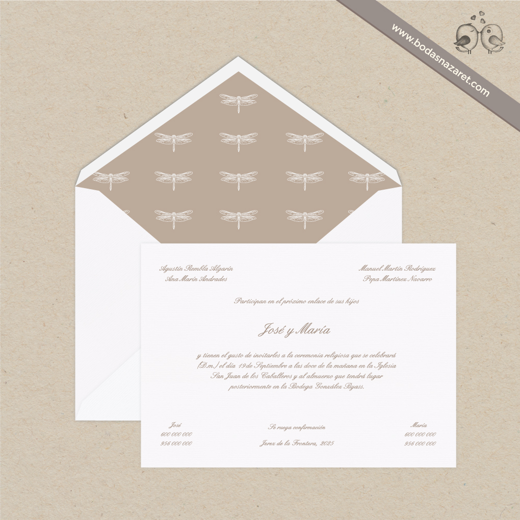Invitación de boda con sobre blanco (22,8x16,5cm) realizado con papel italiano natural de alta calidad (140g) con textura rayada por ambas caras, forrado de manera artesanal y con tarjetón crema vejurado de 300g (22x15,5cm) a juego totalmente personalizable. Con un diseño de libélulas, es una opción ideal para una boda alegre y chic.Además, también puedes personalizar:
