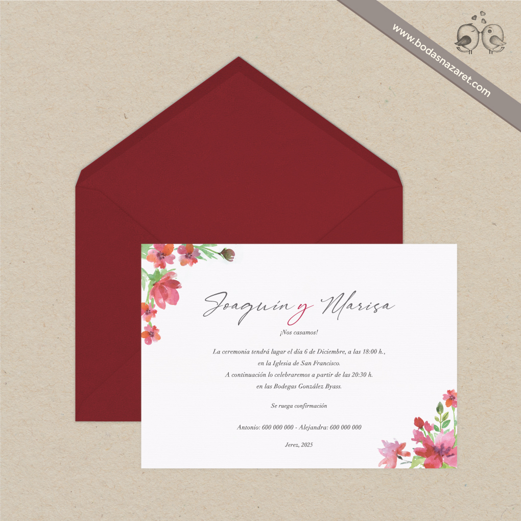 Invitación de boda con sobre rojo (22,8x16,5cm) realizado con papel italiano liso de alta calidad (140g), con tarjetón blanco verjurado de 300g (22x15,5cm) totalmente personalizable. Con un diseño de flores de acuarela, es una opción ideal para una boda apasionante y chic.Además, también puedes personalizar: