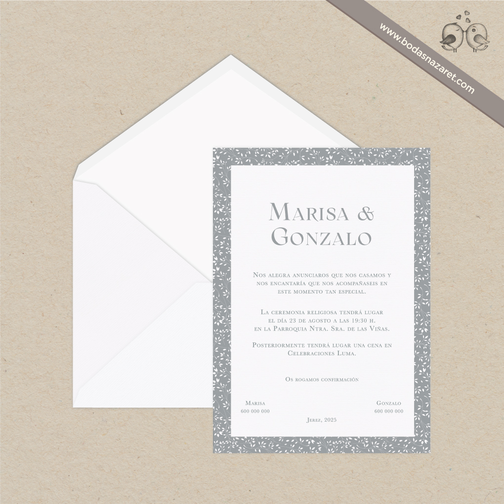 Invitación de boda con sobre blanco (22,8x16,5cm) realizado con papel italiano verjurado de alta calidad (150g), con tarjetón blanco verjurado de 300g (22x15,5cm) a juego totalmente personalizable. Con un diseño minimalista, es una opción ideal para una boda moderna y chic.