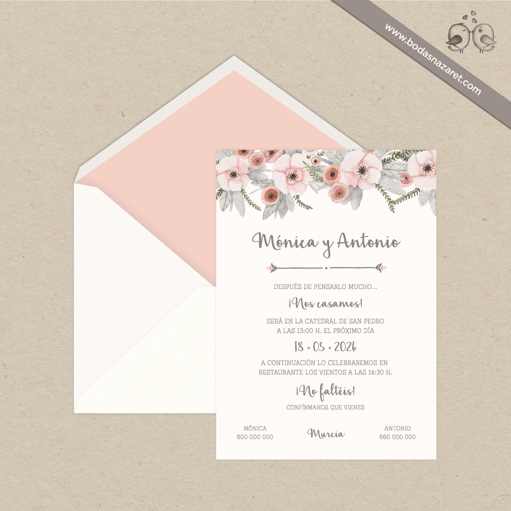 Invitación de boda con sobre blanco (22,8x16,5cm) realizado con papel italiano verjurado de alta calidad (140g), forrado de manera artesanal y con tarjetón blanco verjurado de 300g (22x15,5cm) a juego totalmente personalizable. Con un diseño floral en tonos pastel, es una opción ideal para una boda alegre y moderna.