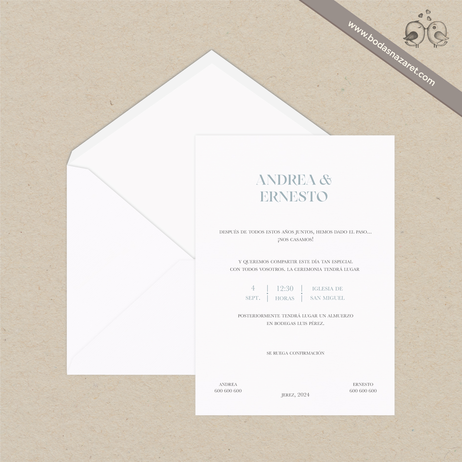 Invitación de boda con sobre blanco (22,8 x 16,5 cm) realizado con papel italiano natural de alta calidad (140 g) con textura rayada por ambas caras y tarjetón blanco verjurado en cartulina de 300g (22 x 15,5 cm), impreso a dos caras totalmente personalizable. Con un diseño moderno, es una opción ideal para una boda alegre y elegante.Además, también puedes personalizar: