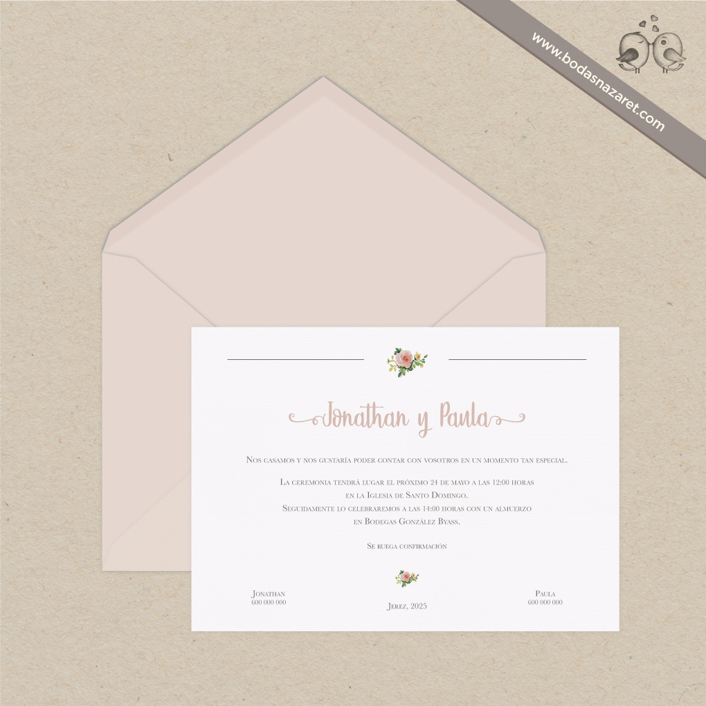 Invitación de boda con sobre rosa nude (22,8x16,5cm) realizado con papel italiano verjurado de alta calidad (140g), con tarjetón verjurado de 300g (22x15,5cm) totalmente personalizable. Con un diseño floral, es una opción ideal para una elegante.