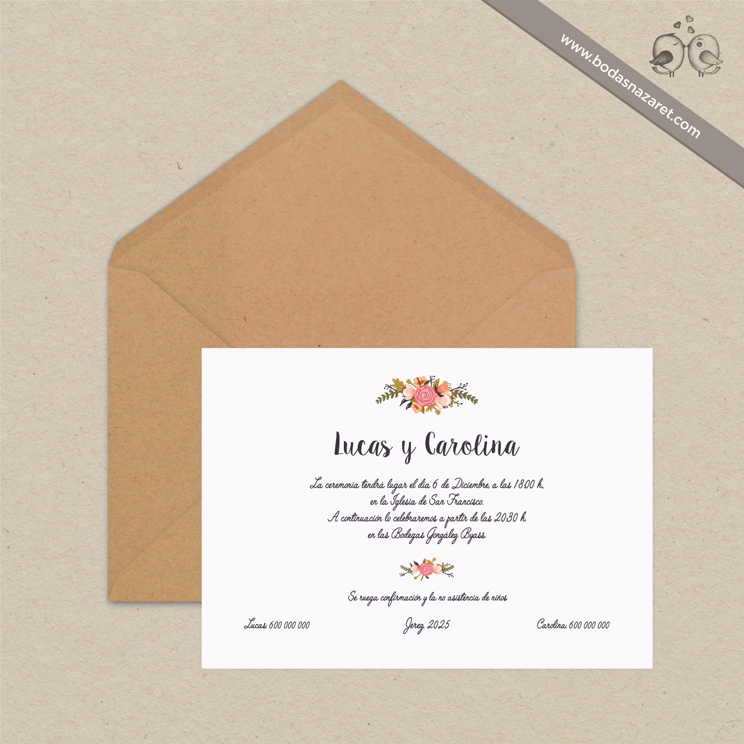 Invitación de boda con sobre realizado con papel kraft (22,8x16,5cm) de alta calidad (130g), con tarjetón verjurado de 300g (22x15,5cm) totalmente personalizable. Con un diseño de flores, es una opción ideal para una boda alegre y sencilla.