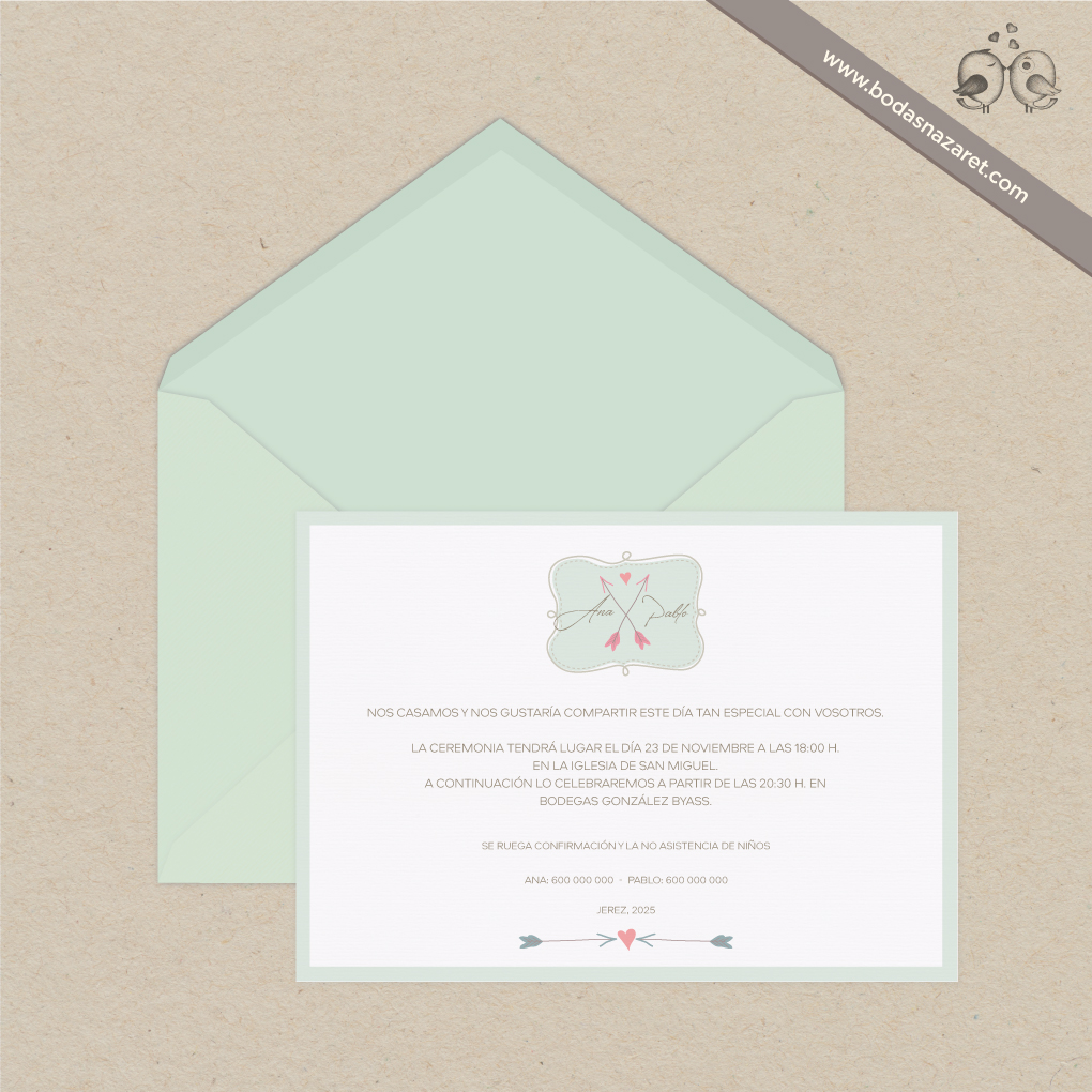 Invitación de boda con sobre verde agua (22,8x16,5cm) realizado con papel italiano natural de alta calidad (140g) con textura rayada por ambas caras y tarjetón blanco verjurado de 300g (22x15,5cm) a juego totalmente personalizable. Con un diseño de flores, es una opción ideal para una boda elegante y chic.Además, también puedes personalizar: