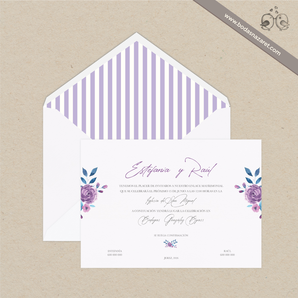 Invitación de boda con sobre malva (22,8x16,5cm) realizado con papel italiano con textura de alta calidad (140g) o sobre blanco (22,8x16,5cm) realizado con papel italiano verjurado de alta calidad (140g), forrado de manera artesanal y con tarjetón blanco verjurado de 300g (22x15,5cm) a juego totalmente personalizable. Con un diseño de flores, es una opción ideal para una boda alegre y vintage.Además, también puedes personalizar: