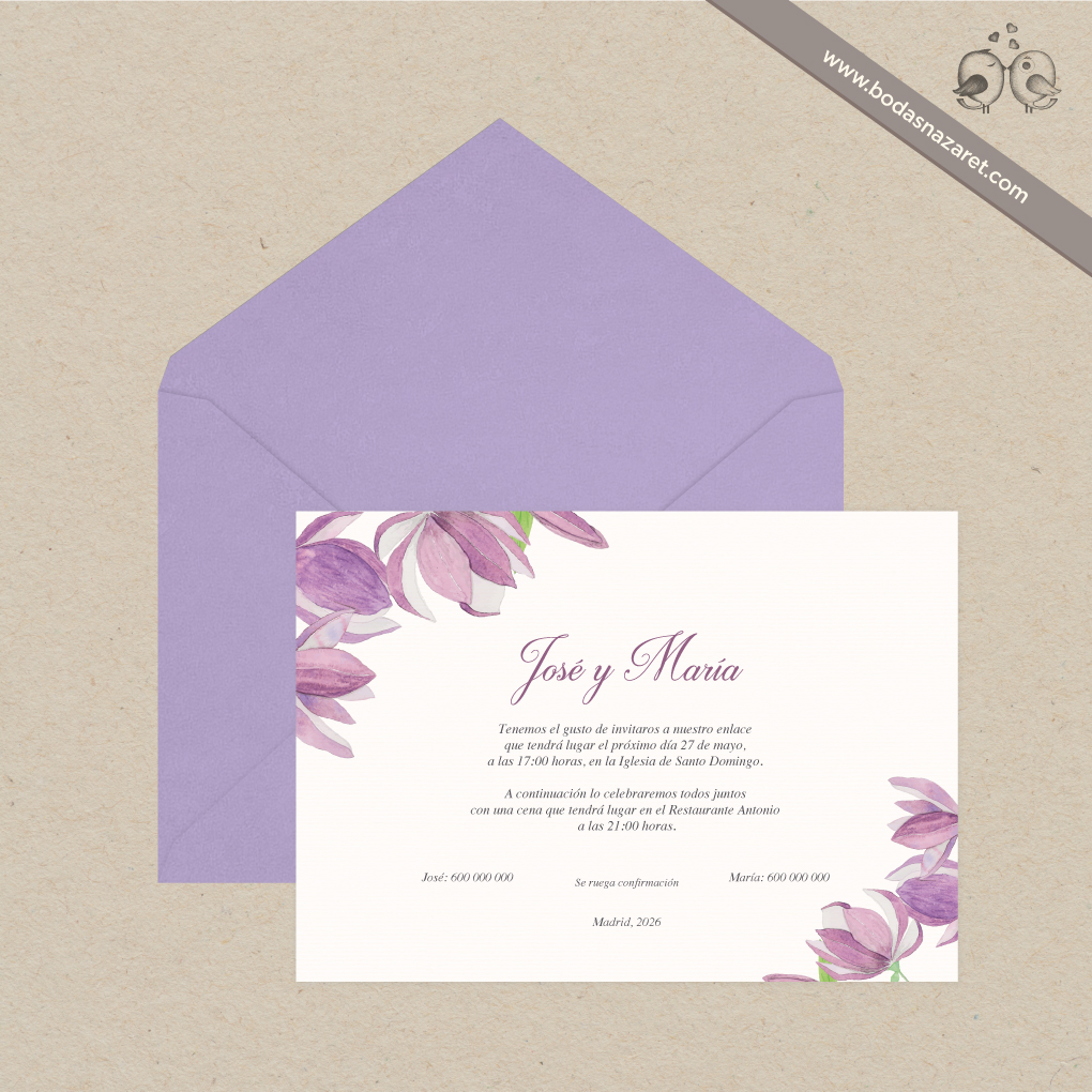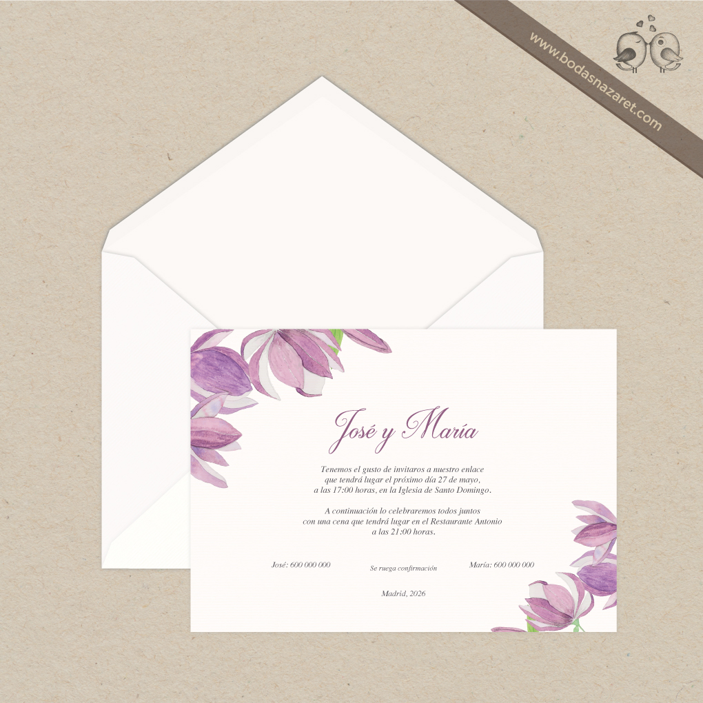Invitación de boda con sobre malva (22,8x16,5cm) realizado con papel italiano con textura de alta calidad (140g) o sobre blanco (22,8x16,5cm) realizado con papel verjurado de alta calidad (140g), con tarjetón blanco verjurado de 300g (22x15,5cm) totalmente personalizable. Con un diseño de flores, es una opción ideal para una boda alegre y vintage.