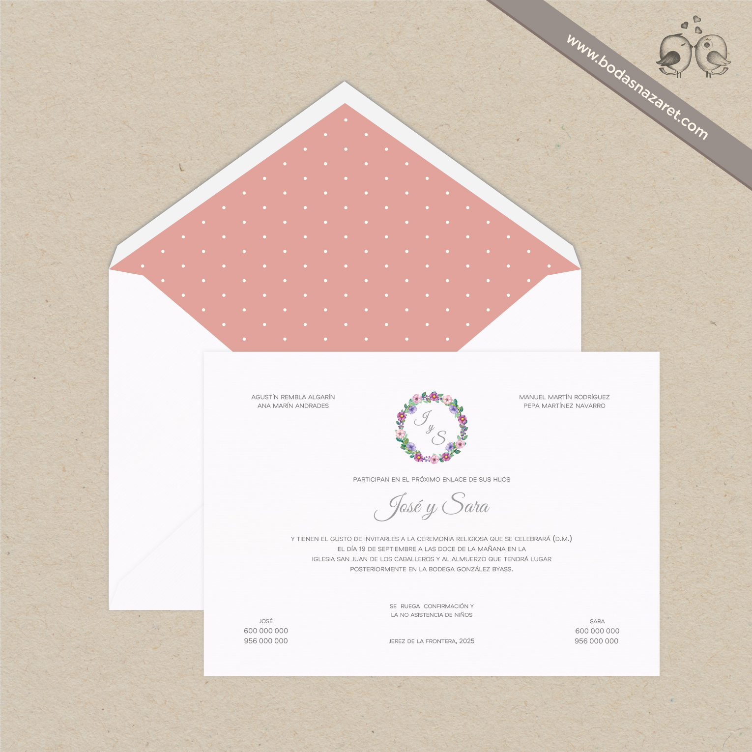 Invitación de boda con sobre blanco (22,8x16,5cm) realizado con papel italiano verjurado de alta calidad (140g), forrado de manera artesanal y con tarjetón blanco verjurado de 300g (22x15,5cm) a juego totalmente personalizable. Con un diseño de topos, es una opción ideal para una boda elegante.Además, también puedes personalizar:
